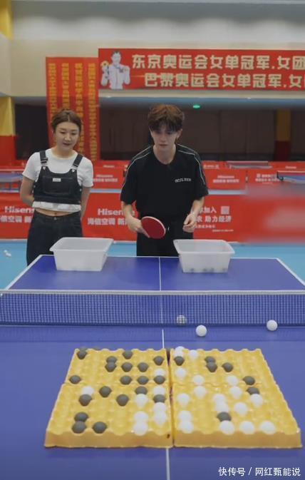 因没有专业球拍,所以两人拿起了一个纸盒当自己的装备,来进行这场乒乓球较量。 虽装备不专业,但任嘉伦握法标准,完全看不出已退役数年。